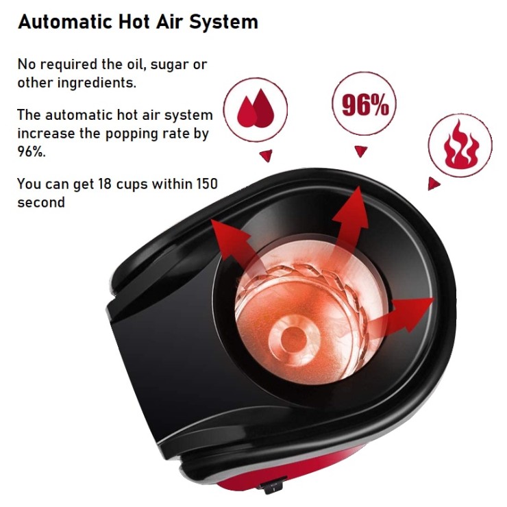 • NOTE: a. Please use high quality corn kernels; b. Don't add too few kernels, too little and the moving air will push out too many unpopped kernels)
