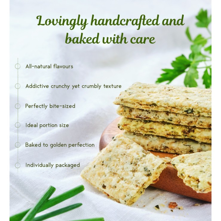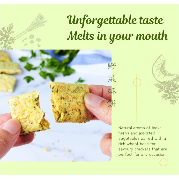 Do you favour savoury over sweet? If your answer is yes then our Garden Mixed Veggie Crackers is the one for you. Savoury, melt-in-your-mouth crackers infused with the aroma and flavour of leeks and herbs, packed with fibre, vitamins and minerals from spinach, parsley, leek and pumpkin. Its rich wheat base gives it a satisfying crunch that gives way to a deliciously crumbly texture filled with the natural flavours of assorted vegetables, perfect for pairing with soups, your afternoon tea or even eaten on its own for a quick and tasty snack.